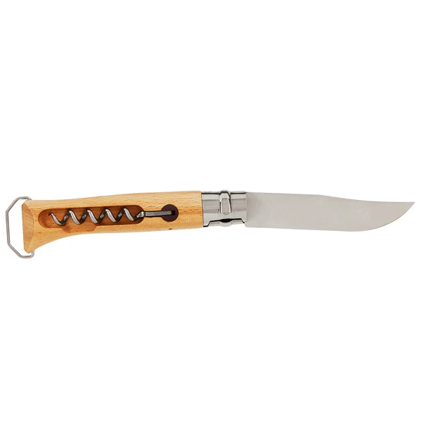 Der Griff verfügt über einen eingebauten Korkenzieher, der sich im 90-Grad-Winkel ausklappen lässt. Er bietet einen festen Griff dank des Buchenholzgriffs und ermöglicht das mühelose Entkorken von Flaschen. Zusätzlich befindet sich am Griffende ein Flaschenöffner.